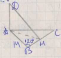 Дано: \( AB = 14 \) см, \( DH = 2\sqrt{43} \) см, \( \angle ABC = 120^\circ \).