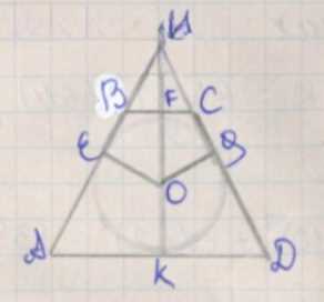 Площадь треугольника, образованного основаниями трапеции, вычисляется по формуле: \(S = \frac{AD \times BC}{2} = \frac{36 \times 16}{2} = 288\) см\(^2\). Это значение позволяет нам убедиться в правильности исходных данных и дальнейших расчетах. Для нахождения расстояния \(MK\) от точки \(M\) до точки \(K\) на стороне трапеции применяем теорему Пифагора: \(MK = \sqrt{MO^{2} + OK^{2}}\). В данном случае \(MO = 16\) см, а \(OK = 12\) см (это расстояние рассчитывается на основании геометрии вписанной окружности и параметров трапеции).