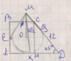 Точка O — центр окружности, вписанной в трапецию ABCD, BC ∥ AD, AB ⟂ AD, CD = 12 см, ∠ADC = 45°. Отрезок MO — перпендикуляр к плоскости трапеции. Точка M удалена от плоскости трапеции на 6√2 см. Найдите расстояние от точки M до сторон трапеции.