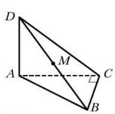 Пусть дан тетраэдр \( DABC \), в котором ребро \( DA \) перпендикулярно плоскости \( ABC \), \( AC = AD \), а угол \( ACB \) равен \( 90^\circ \). Обозначим точку \( M \) как середину ребра \( BD \). Требуется построить сечение тетраэдра плоскостью, проходящей через точку \( M \) и перпендикулярной прямой \( CD \).