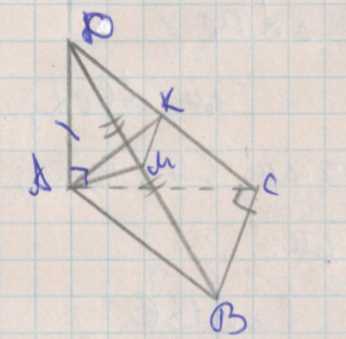 Для начала отметим, что плоскость, проходящая через точку \( M \) и перпендикулярная прямой \( CD \), обязательно будет содержать все точки, находящиеся на расстоянии, равном расстоянию от \( M \) до \( CD \), если провести из них перпендикуляр к \( CD \). Чтобы определить вторую точку пересечения этой плоскости с тетраэдром, рассмотрим пересечение этой плоскости с ребром \( DC \). Через точку \( M \) проводим прямую, перпендикулярную \( CD \) и лежащую в искомой плоскости, она пересекает \( DC \) в точке \( K \).