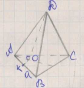 Рассмотрим правильный тетраэдр \(DABC\) с длиной ребра \(a\). Все его грани — равносторонние треугольники, а высота, опущенная из вершины \(D\) на основание \(ABC\), обозначается как \(DO\). Точка \(O\) — центр основания \(ABC\), так как высота в правильном тетраэдре всегда проходит через центр основания. Длина этой высоты находится по формуле: \(DO = a \cdot \sqrt{\frac{2}{3}}\).