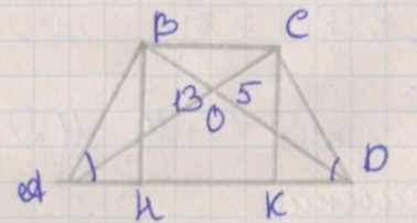 Дано: трапеция \(ABCD\), \(AB = CD\), диагонали — биссектрисы, \(BO : OD = 5 : 13\), высота \(BH = 9\) см.