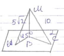 По определению, синус угла между наклонной и плоскостью равен отношению длины перпендикуляра, опущенного из данной точки на плоскость, к длине наклонной. Для прямой \(MA\) имеем: \(\sin 45^\circ = \frac{MB}{MA}\). Подставляем известные значения: \(\sin 45^\circ = \frac{\sqrt{2}}{2}\), \(MA = 5\sqrt{2}\). Получаем уравнение: \(\frac{\sqrt{2}}{2} = \frac{MB}{5\sqrt{2}}\). Перемножая крест-накрест, имеем: \(MB = 5\sqrt{2} \cdot \frac{\sqrt{2}}{2} = 5\), так как \(\sqrt{2} \cdot \sqrt{2} = 2\), а \(2\) делим на \(2\).