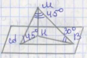 Для начала вычислим длины проекций наклонных на плоскость \(\alpha\). Проекция \(MA\) на плоскость равна \(HA = MA \cdot \sin 45^\circ = 6 \cdot \frac{\sqrt{2}}{2} = 3\sqrt{2}\) см. Аналогично, проекция \(MB\) на плоскость равна \(HB = MB \cdot \sin 30^\circ = 6 \cdot \frac{1}{2} = 3\) см. Таким образом, точки \(A\) и \(B\) лежат на расстояниях \(3\sqrt{2}\) и \(3\) см от основания перпендикуляра \(H\), проведённого из точки \(M\) на плоскость \(\alpha\).