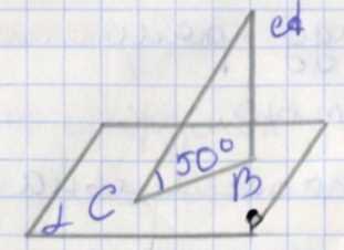 В пространстве угол между наклонной и перпендикуляром определяется следующим образом: если наклонная образует с плоскостью угол \(\alpha\), то угол между наклонной и перпендикуляром равен \(90^\circ — \alpha\). Это связано с тем, что наклонная, её проекция на плоскость и перпендикуляр к плоскости из одной и той же точки образуют прямоугольный треугольник, где один угол прямой (\(90^\circ\)), второй равен углу между наклонной и плоскостью (\(50^\circ\)), а третий — искомый угол между наклонной и перпендикуляром.