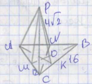 Точка \(P\) находится на расстоянии \(PO = 4\sqrt{2}\) от плоскости, а \(CO = 10\).
