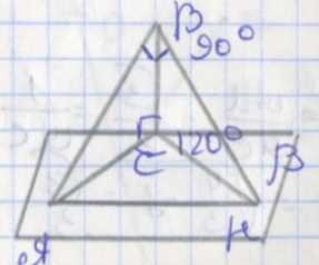 Две равные наклонные \(BA\) и \(BC\) из точки \(B\) к плоскости \(\beta\) образуют угол \(90^\circ\), а угол между их проекциями на плоскость равен \(120^\circ\). Пусть длина наклонной \(l\), а длина её проекции на плоскость \(x\).