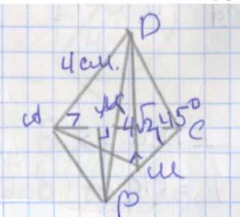 Тетраэдр \(DABC\) имеет ребро \(AD\), перпендикулярное плоскости \(ABC\), следовательно, \(AD \perp AM\) и \(AD \perp BK\), так как \(AM\) и \(BK\) лежат в плоскости \(ABC\). Высоты \(AM\) и \(BK\) перпендикулярны сторонам \(BC\) и \(AC\) соответственно. Из условия известно, что угол \(ACB = 45^\circ\), длина \(AD = 4\) см, а \(AC = 4\sqrt{2}\) см. Это позволяет определить взаимное расположение точек и векторов в пространстве.