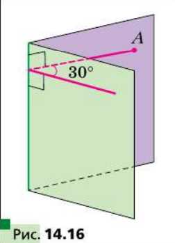 На одной из граней двугранного угла, величина которого равна \(30^\circ\), отмечена точка \(A\) (рис. 14.16). Расстояние от точки \(A\) до ребра двугранного угла равно \(18\) см. Чему равно расстояние от точки \(A\) до другой грани двугранного угла?