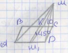 Расстояние от точки \(M\) до прямой \(AD\) равно \(10\) см. Это расстояние — длина перпендикуляра, опущенного из точки \(M\) на прямую \(AD\). Рассмотрим проекцию точки \(M\) на плоскость квадрата — обозначим её \(K\). Проекция \(MK\) будет лежать в плоскости квадрата и образует с прямой \(AD\) угол, связанный с углом между плоскостями. Так как угол между плоскостями равен \(45^\circ\), то длина проекции \(MK\) равна \(10 \cdot \cos 45^\circ = 10 \cdot \frac{\sqrt{2}}{2} = 5\sqrt{2}\) см.