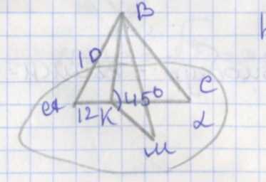 В равнобедренном треугольнике \(ABC\) с основанием \(AC = 12\) и боковыми сторонами \(AB = BC = 10\) сначала находим высоту \(BH\), опущенную из вершины \(B\) на основание \(AC\). Поскольку \(ABC\) равнобедренный, точка \(H\) является серединой отрезка \(AC\), следовательно, \(AH = \frac{AC}{2} = 6\). Используем теорему Пифагора в прямоугольном треугольнике \(BHA\), где \(BH\) — высота, \(AB\) — гипотенуза, а \(AH\) — катет. Тогда \(BH = \sqrt{AB^{2} — AH^{2}} = \sqrt{10^{2} — 6^{2}} = \sqrt{100 — 36} = \sqrt{64} = 8\).
