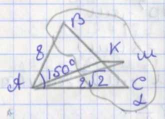 Рассмотрим треугольник \(BKC\), где \(K\) — проекция \(A\) на плоскость \(\alpha\). Поскольку угол \(ABC = 150^\circ\), угол \(CBK\) в плоскости \(\alpha\) равен \(30^\circ\), так как \(K\) лежит на \(BC\). В этом треугольнике по свойствам равнобедренного треугольника длина \(BK\) равна половине \(AB\), то есть \(BK = \frac{1}{2} AB = 4\) см.
