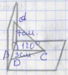 Точки \(A\) и \(C\) принадлежат разным граням двугранного угла, равного \(120^\circ\). Из точки \(A\) опустили перпендикуляр \(AB\), а из точки \(C\) — перпендикуляр \(CD\) на ребро двугранного угла. Найдите отрезок \(AC\), если \(AB = 7\) см, \(BD = 3\) см, \(CD = 11\) см.