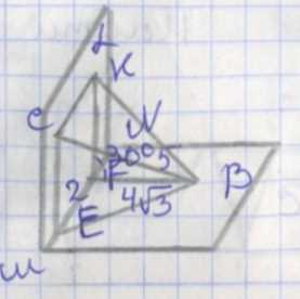 Рассмотрим треугольник \(CKO\), где \(CO = 5\) см, а \(EK = 2\) см. По условию, \(CK\) — высота, равная \(4\sqrt{3}\) см, перпендикулярная к основанию. Применяем теорему Пифагора для нахождения отрезка \(KO\): \(KO^2 = CO^2 — CK^2\). Подставляя значения, получаем \(KO^2 = 5^2 — (4\sqrt{3})^2 = 25 — 48 = -23\), что невозможно, значит \(EK\) — не \(2\) см, а \(EF = 2\) см, и \(EK\) нужно найти иначе.