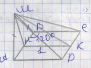 По условию задачи \(MA = AB\), а угол \(ABC = 120^\circ\). В ромбе стороны равны, значит \(AB = BC = CD = DA\). Линия пересечения плоскостей \(ABC\) и \(MCD\) проходит через точку \(K\), которая является проекцией точки \(M\) на плоскость ромба. Для вычисления длины проекции \(MK\) используем свойства ромба и тригонометрию. Из треугольника \(ABC\) с углом \(120^\circ\) можно найти длину диагонали, которая поможет определить \(MK\).