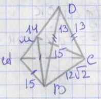 Теперь рассмотрим треугольник BCD, в котором стороны \(BC = 12\sqrt{2}\), \(BD = 13\), \(CD = 13\). Для определения угла между плоскостями BAD и CAD нужно найти угол между высотами BM и CM, которые лежат в этих плоскостях. Используем теорему косинусов в треугольнике BMC: \(BC^2 = BM^2 + CM^2 — 2 \times BM \times CM \times \cos \theta\), где \(\theta\) — искомый угол. Подставим значения: \((12\sqrt{2})^2 = 12^2 + 12^2 — 2 \times 12 \times 12 \times \cos \theta\), что даёт \(288 = 144 + 144 — 288 \cos \theta\), откуда \(288 = 288 — 288 \cos \theta\) и \(\cos \theta = 0\). Следовательно, угол \(\theta\) равен \(90^\circ\), то есть плоскости BAD и CAD перпендикулярны.