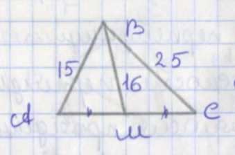 Даны стороны \(AB=15\), \(BC=25\) и медиана \(BM=16\).