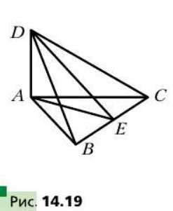 Отрезок \(AD\) — перпендикуляр к плоскости правильного треугольника \(ABC\) (рис. 14.19), точка \(E\) — середина стороны \(BC\). Среди приведённых углов укажите линейный угол двугранного угла, грани которого принадлежат плоскостям \(ABC\) и \(BCD\):