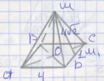 Пусть центр квадрата \(O\) и точка \(M\) имеют координаты \(O(2,2,0)\), \(M(2,2,4\sqrt{2})\). Векторы \(\vec{CM} = (-2,-2,4\sqrt{2})\), \(\vec{CD} = (-4,0,0)\).