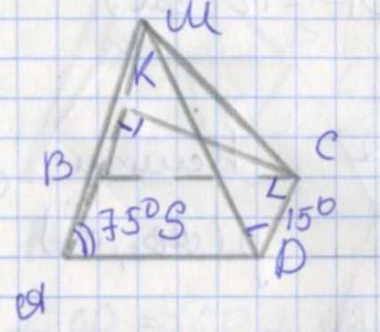 Грань \(MCD\) образует с плоскостью основания угол 15°, а грань \(MAD\) — угол 75°. Эти углы показывают наклон ребер \(MD\) и \(MA\) относительно основания. Сумма этих углов равна 90°, что указывает на то, что ребра \(MA\) и \(MC\) перпендикулярны друг другу. Тогда треугольник \(MAB\), образованный ребрами \(MA\), \(MB\) и \(AB\), является прямоугольным, где \(MB\) — гипотенуза, а \(MA\) и \(MC\) — катеты.