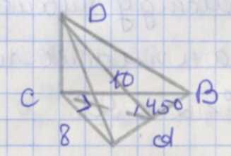\(AC = 8\) см, \(BC = 10\) см, а угол между плоскостями \(ABC\) и \(ABD\) равен 45°.
