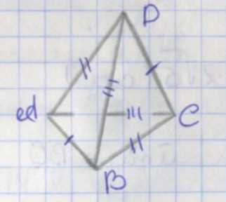 В тетраэдре \(DABC\) по условию противоположные ребра равны: \(AB = CD\), \(BC = AD\), \(CA = BD\). Это свойство указывает на особую симметрию фигуры, которая влияет на углы между рёбрами и, следовательно, на углы граней. Рассмотрим вершину \(A\). Из равенств \(BC = AD\) и \(CA = BD\) видно, что длины рёбер, исходящих из вершины \(A\), связаны с длинами противоположных рёбер. Такая симметрия гарантирует, что углы при вершине \(A\) в гранях \(ABC\), \(ACD\) и \(ABD\) не могут быть прямыми или тупыми.