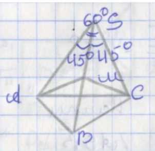Плоские углы \(ASB\), \(BSC\) и \(CSA\) трёхгранного угла \(SABC\) равны 45°, 45° и 60° соответственно. Найдите двугранный угол при ребре \(SB\).