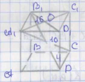Основание призмы — ромб с диагоналями длиной 16 см и 10 см. Высота призмы равна 4 см. Для нахождения стороны ромба, учитывая высоту призмы, нужно рассмотреть диагональ, проходящую через верхнюю и нижнюю грань призмы. Эта диагональ в пространстве обозначена как \( B_1D \).