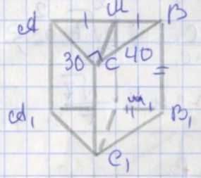 В прямоугольном треугольнике \(ABC\) с прямым углом при вершине \(C\) даны катеты \(AC=30\) см и \(BC=40\) см. Для начала находим гипотенузу \(AB\) по теореме Пифагора: \(AB = \sqrt{AC^{2} + BC^{2}} = \sqrt{30^{2} + 40^{2}} = \sqrt{900 + 1600} = \sqrt{2500} = 50\) см. Высота призмы равна длине гипотенузы основания, то есть \(h = 50\) см. Это значит, что верхнее основание призмы — треугольник \(A_1 B_1 C_1\) — расположено параллельно плоскости основания \(ABC\) на высоте 50 см.