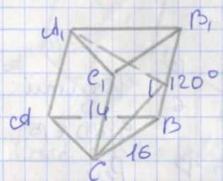 Двугранный угол при одном из боковых рёбер наклонной треугольной призмы равен \(120^\circ\). Расстояние от данного ребра до одного из остальных боковых рёбер равно 16 см, а до другого — 14 см. Найдите боковое ребро призмы, если площадь её боковой поверхности равна 840 см².
