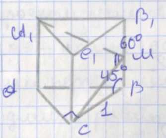 Основание призмы — прямоугольный треугольник с катетом \(BC = 1\). Проекция \(B_1\) на плоскость основания совпадает с точкой \(C\). Угол \(\angle B_1 BC = 45^\circ\), двугранный угол при ребре \(BB_1 = 60^\circ\).