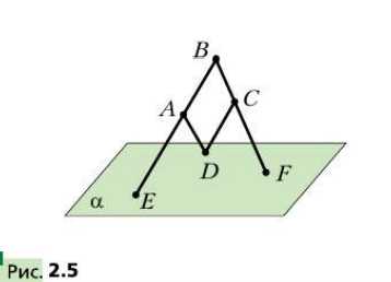 Найдите ошибку на рисунке 2.5, если известно, что вершина \( D \) четырёхугольника \( ABCD \) лежит в плоскости \( \alpha \), вершины \( A, B \) и \( C \) не лежат в этой плоскости, прямая \( AB \) пересекает плоскость \( \alpha \) в точке \( E \), прямая \( BC \) — в точке \( F \). Выполните правильный рисунок.
