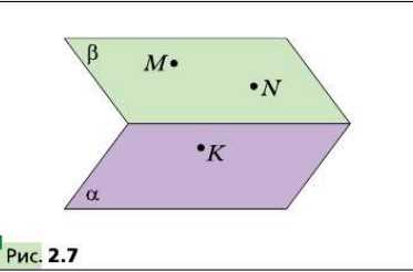 Точка \( K \) принадлежит плоскости \( \alpha \), а точки \( M \) и \( N \) — плоскости \( \beta \) (рис. 2.7). Постройте прямую пересечения плоскостей \( \beta \) и \( MNK \).