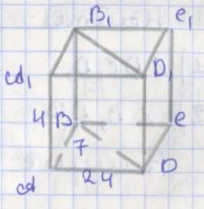 Стороны основания равны 7 см и 24 см, высота 4 см. Найдём диагональ основания \( BD = \sqrt{7^2 + 24^2} = \sqrt{49 + 576} = 25 \) см.