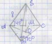 4. Для нахождения площади треугольника основания \(ABC\) используем формулу площади через две стороны и угол между ними: \(S_{ABC} = \frac{1}{2} \cdot AB \cdot BC \cdot \sin 120^\circ\). Подставляя \(AB = BC = x\) и \(\sin 120^\circ = \frac{\sqrt{3}}{2}\), имеем \(S_{ABC} = \frac{1}{2} \times x \times x \times \frac{\sqrt{3}}{2} = \frac{\sqrt{3}}{4} x^2\). Подставляя найденное значение \(x^2 = \frac{128}{3}\), получаем \(S_{ABC} = \frac{\sqrt{3}}{4} \times \frac{128}{3} = 8 \sqrt{3}\). Это и есть площадь основания пирамиды.
