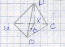 Найдём \(OK\) — проекцию вершины \(D\) на основание \(BC\):