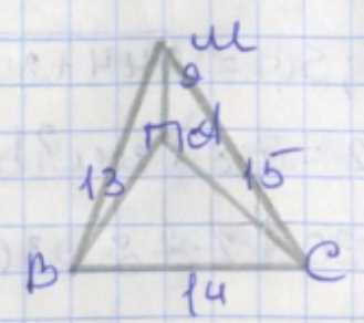 1. Для нахождения площади грани \(MBC\) сначала рассмотрим треугольник основания \(ABC\). Длины сторон даны: \(AB = 13\) см, \(BC = 14\) см, \(AC = 15\) см. Чтобы найти площадь треугольника \(ABC\), применим формулу Герона. Сначала вычислим полупериметр \(p\) по формуле \(p = \frac{AB + BC + AC}{2}\). Подставляя значения, получаем \(p = \frac{13 + 14 + 15}{2} = \frac{42}{2} = 21\) см.