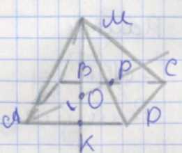 2. Пусть \(O\) — центр основания \(ABCD\). В правильной четырёхугольной пирамиде центр основания \(O\) совпадает с точкой пересечения диагоналей основания. Тогда угол между прямыми \(AP\) и \(KM\) равен углу между отрезками \(AO\) и \(KO\), то есть \(\angle AOK\). Это связано с тем, что точки \(P\) и \(K\) — середины рёбер основания, и векторное расположение этих точек позволяет свести задачу к вычислению угла между векторами \(AO\) и \(KO\).