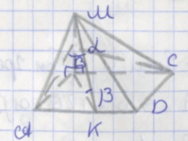 Угол между плоскостью \(AMD\) и основанием равен \(\beta\), что влияет на высоту и наклон соответствующей боковой грани. Этот угол вводит дополнительный множитель, учитывающий наклон плоскости, который выражается через \(\tan \beta\) и \(\cos \beta\). В итоге площадь боковой поверхности выражается формулой \( \frac{a^2 \sin \alpha (1 + \tan \beta)}{\cos \beta} \), где числитель отражает сумму влияния углов \(\alpha\) и \(\beta\), а знаменатель корректирует площадь с учётом наклона грани относительно основания.