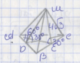 Основанием пирамиды МАВС является треугольник АВС такой, что \(\angle АСВ = 90^\circ\), \(\angle ВАС = 60^\circ\), \(АС = 4 \sqrt{3}\) см. Плоскость грани ВМС перпендикулярна плоскости основания, а плоскости двух других граней наклонены к плоскости основания под углом \(30^\circ\). Найдите ребро МС.