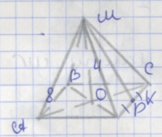 Проекция прямой \(MK\) на основание проходит через \(O\).
