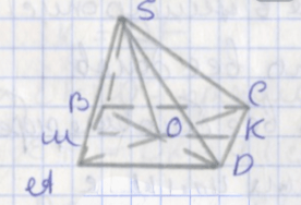 3) Рассмотрим двугранные углы при рёбрах основания. Пусть ребро основания \( SO \) и две плоскости, образованные боковыми рёбрами и радиусами основания, например, \( S K O \) и \( S U O \).