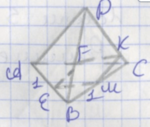 3. Сечение, параллельное этим ребрам, будет иметь форму параллелограмма, но в данном случае — прямоугольного треугольника, образованного отрезками, параллельными \( EF \) и \( FK \).
