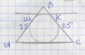 В треугольнике \(ABC\) известно, что \(AB = BC = 25\) см, \(AC = 14\) см. К окружности, вписанной в данный треугольник, проведена касательная, параллельная основанию \(AC\) и пересекающая стороны \(AB\) и \(BC\) в точках \(M\) и \(K\) соответственно. Найдите площадь треугольника \(MBK\).