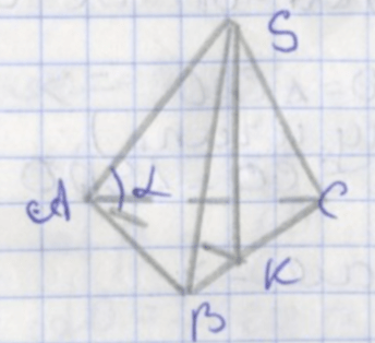 Высота \(SO\) пирамиды перпендикулярна плоскости основания, значит угол между \(SO\) и \(SA\) равен \(\alpha\).
