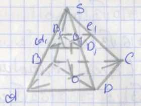 Сторона нижнего основания \(AB = 8\), сторона верхнего основания \(A_1B_1 = 6\), высота пирамиды \(SO = 3\sqrt{3}\).