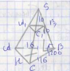 Длина \(AC\) в основании \(ABC\) находится по теореме косинусов: \(AC^2 = AB^2 + BC^2 — 2 \cdot AB \cdot BC \cdot \cos 120^\circ = 256 + 256 + 256 = 768\), значит \(AC = 16 \sqrt{3}\).