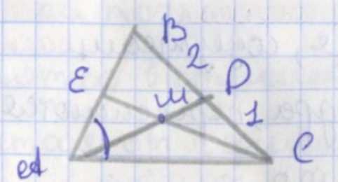 Это означает, что точка пересечения медианы \(CE\) и биссектрисы \(AD\) делит биссектрису в отношении \(AM : MD = t : (1 — t) = \frac{3}{4} : \frac{1}{4} = 3 : 1\), считая от вершины \(A\).