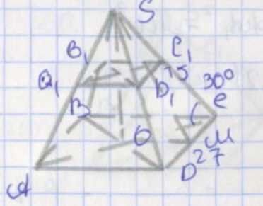1) Пусть \(a = 15\) и \(b = 27\) — стороны меньшего и большего оснований усечённой пирамиды, которые являются квадратами. Полуразность сторон равна \( \frac{b — a}{2} = \frac{27 — 15}{2} = 6 \). Это расстояние по горизонтали от стороны большого основания до соответствующей стороны малого основания. Высота пирамиды \(SO\) связана с этим расстоянием и углом между боковым ребром и плоскостью основания. По определению тангенса угла \(30^\circ\) имеем \( \tan 30^\circ = \frac{SO}{6} \), откуда \( SO = 6 \cdot \tan 30^\circ = 6 \cdot \frac{1}{\sqrt{3}} = 2 \sqrt{3} \).